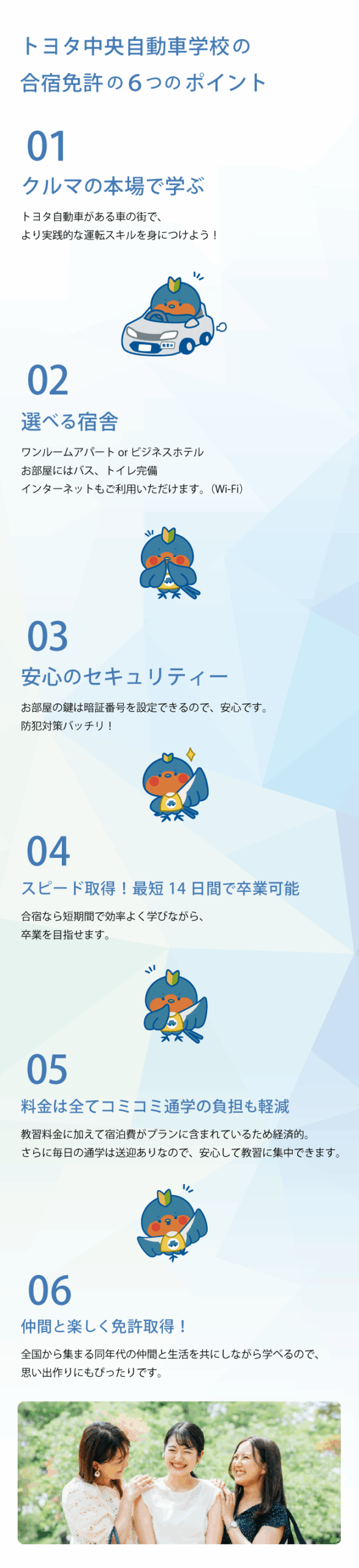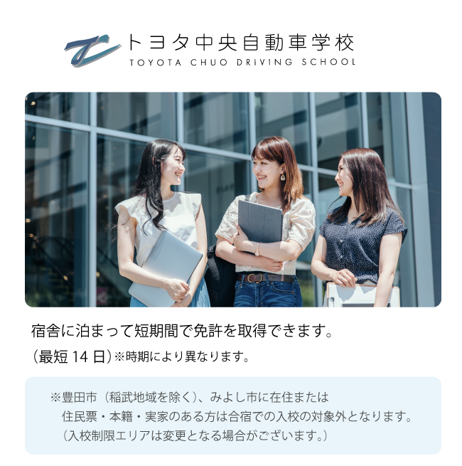 ●豊田市(稲武地域を除く)、みよし市に在住・住民票・実家・本籍がある方は合宿にてご入校いただけません。