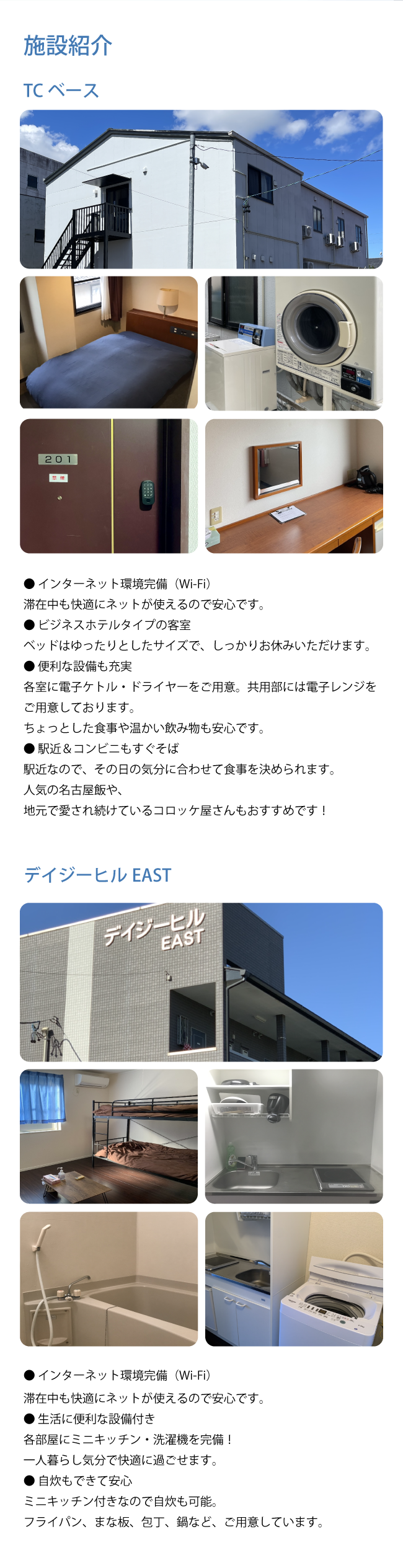 ※宿舎が満室の場合はホテルをご用意します。その場合の宿泊費用は5,000円(税込)/日です。